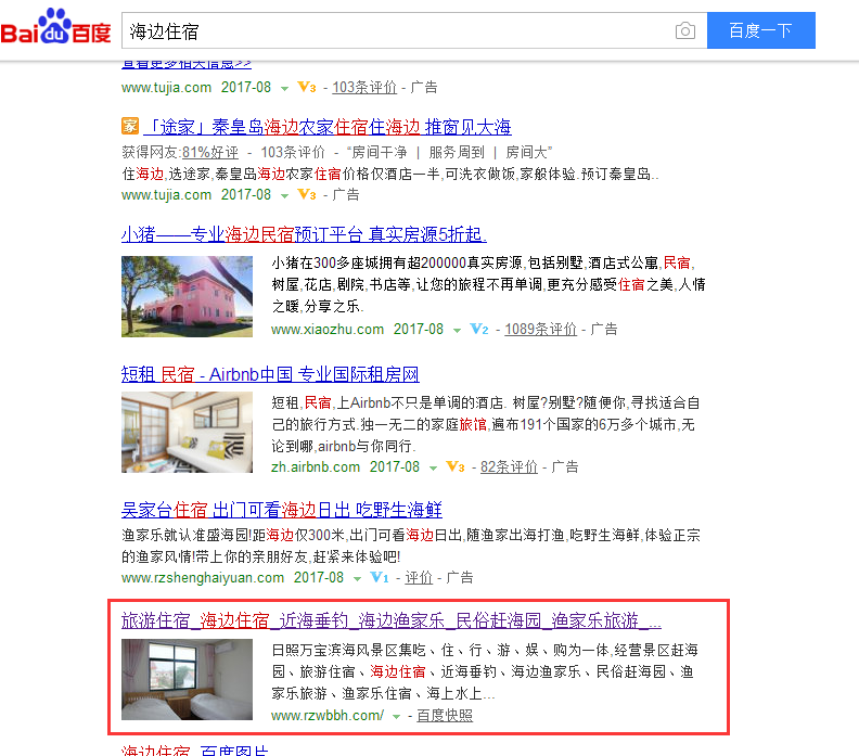 結(jié)合生活實例,比如我們打算去海邊旅游,肯定要考慮晚上的住宿問題,一般會在搜索引擎欄輸入“海邊住宿”,下面出來相關(guān)的結(jié)果標識為百度快照的即為SEO展示結(jié)果。例如“http://www.rzwbbh.com/”該站通過SEO技術(shù)做了“海邊住宿”的關(guān)鍵詞排名,搜索引擎展示效果如下圖:
