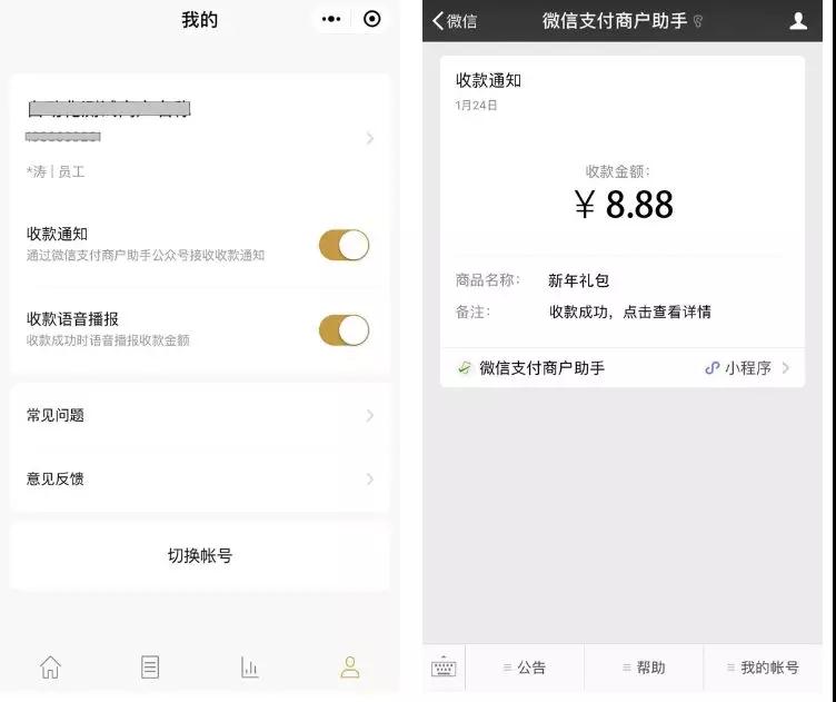為了幫助商戶及時(shí)獲知用戶支付狀態(tài),微信上線了微信支付公眾號(hào)消息和語音播報(bào)兩種收款通知方式??梢栽谖⑿胖Ц渡虘糁中〕绦蛑虚_通使用該功能。